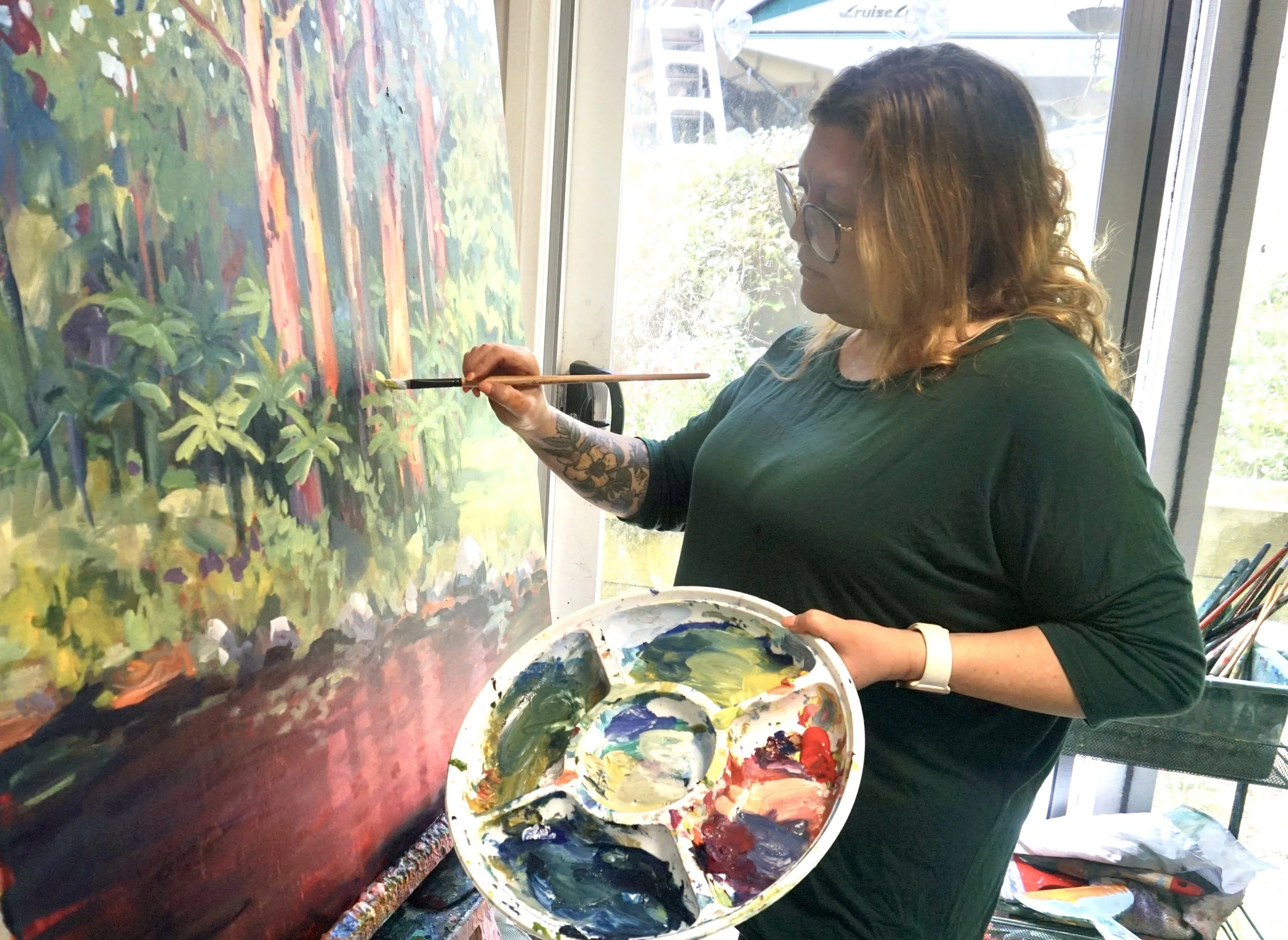 I am intentional in my use of colour palettes, seeking to reflect the natural harmony found in the world around us while also exploring more unconventional combinations. My process is intuitive and spontaneous, allowing each painting to develop organically as I build each layer of paint.