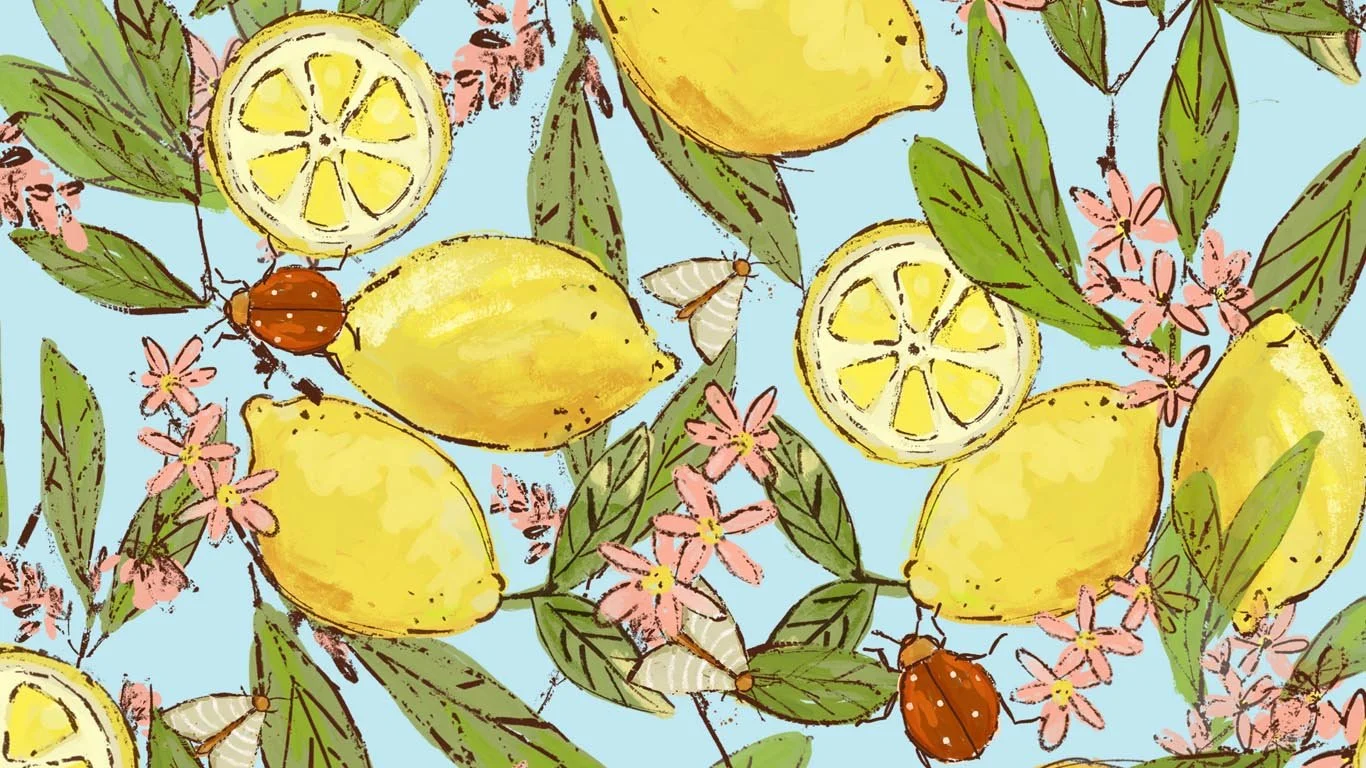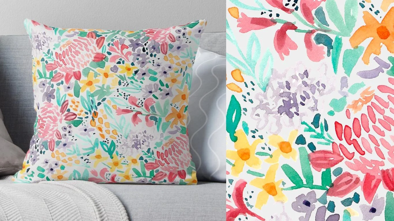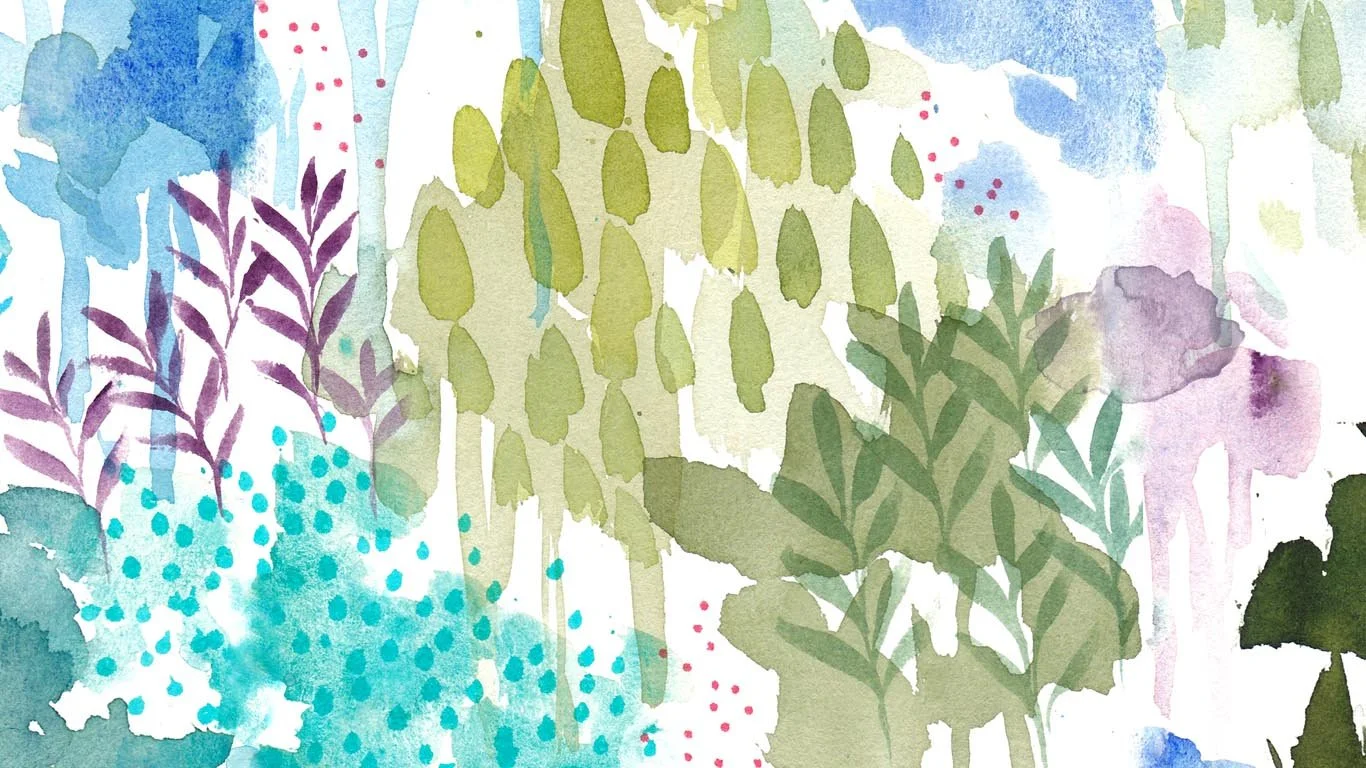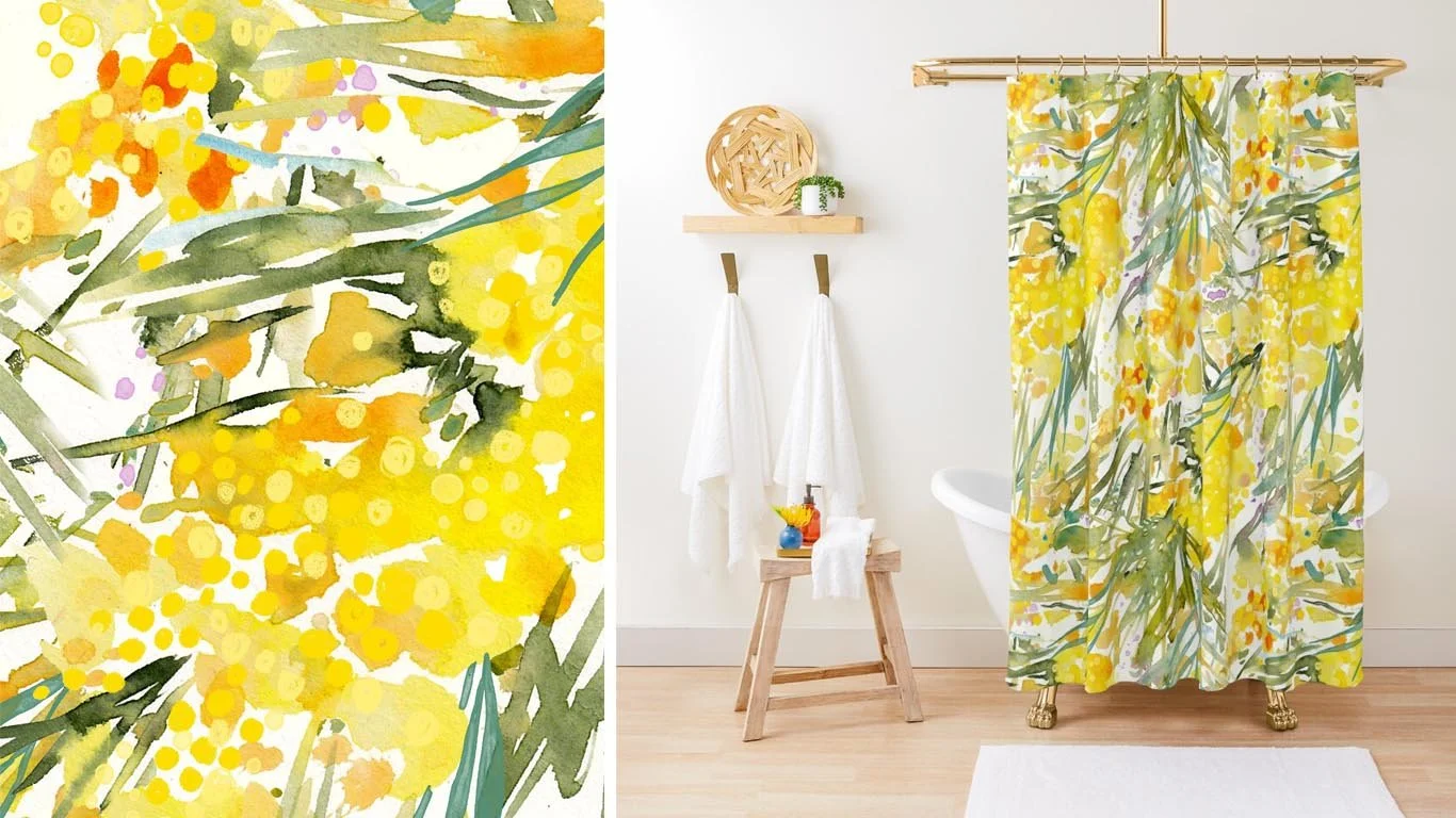 Hand-painted watercolour Wattle, half drop repeat pattern.