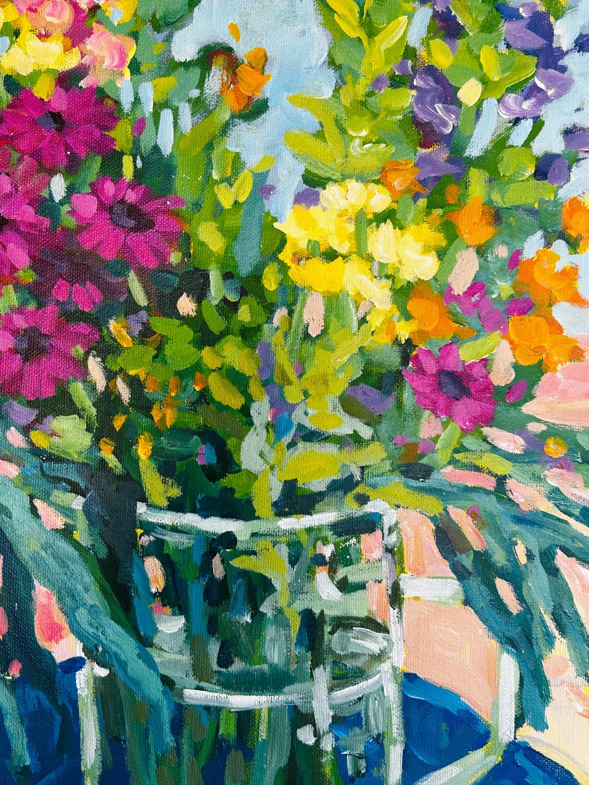 An expressive and colourful still life composition featuring a delightful collection of books, a bunch of succulent grapes, and an array of vibrant flowers that bring the scene to life.